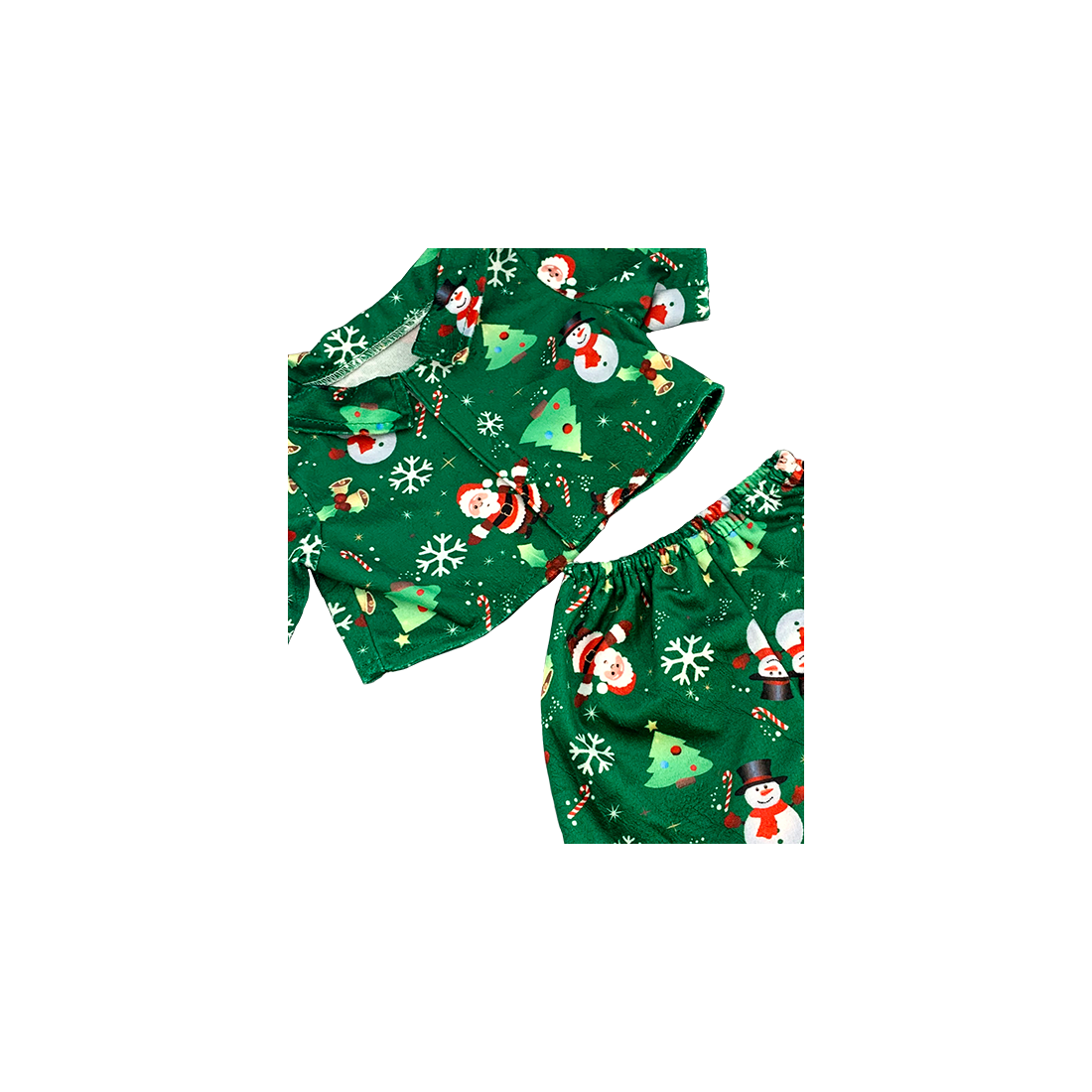 Ein festliches Outfit für die Feiertage! Dieser grüne Pyjama für Plüschtiere besteht aus einem Hemd mit Knöpfen und einer passenden Hose mit Gummibund, verziert mit Schneemännern und Tannen.