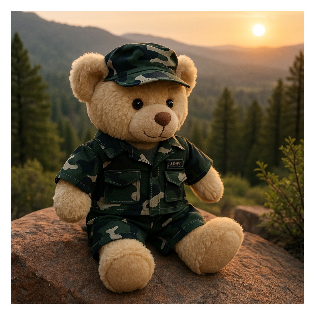 Militärisches Tarn-Outfit für Plüschtiere: Hemd, Shorts und passende Mütze. Hergestellt von Teddy Mountain.