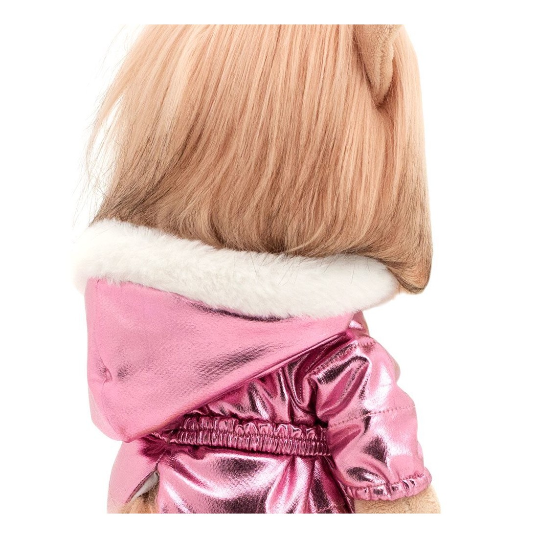 Die bewegliche Plüschfigur Lucky Yoyo (Serie Lucky Doggy, Ref. LD2/081) trägt einen Winter-Overall in Metallic-Rosa mit glänzender Oberfläche, Reißverschluss vorne und elastischem Bund für perfekten Sitz.