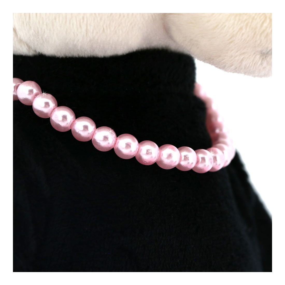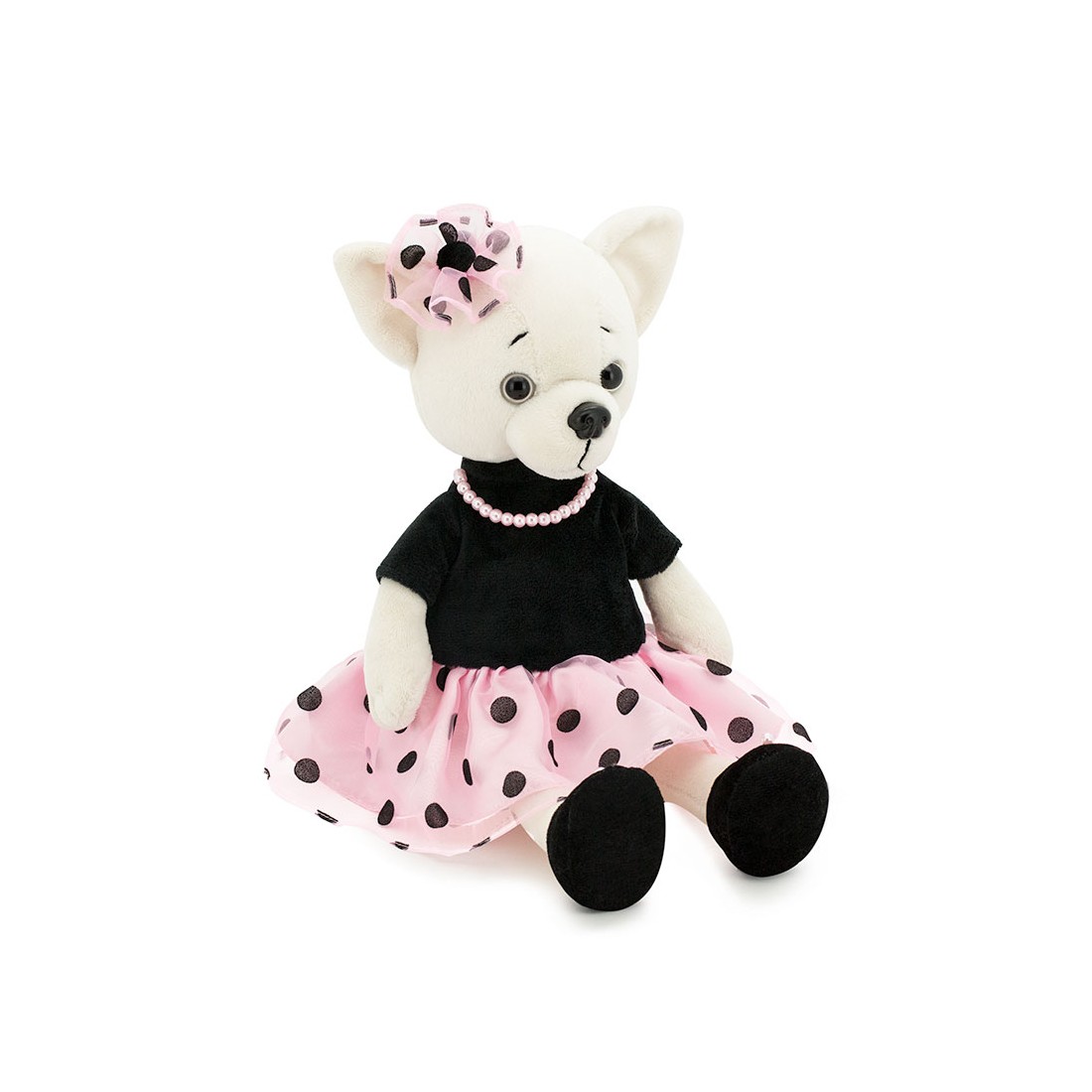 Lucky Lili verzaubert mit einem Retro-Stil: rosa Kleid mit schwarzen Punkten, Perlenkette und passender Schleife. Eine weiche, elegante Plüschfigur ohne Metallrahmen.