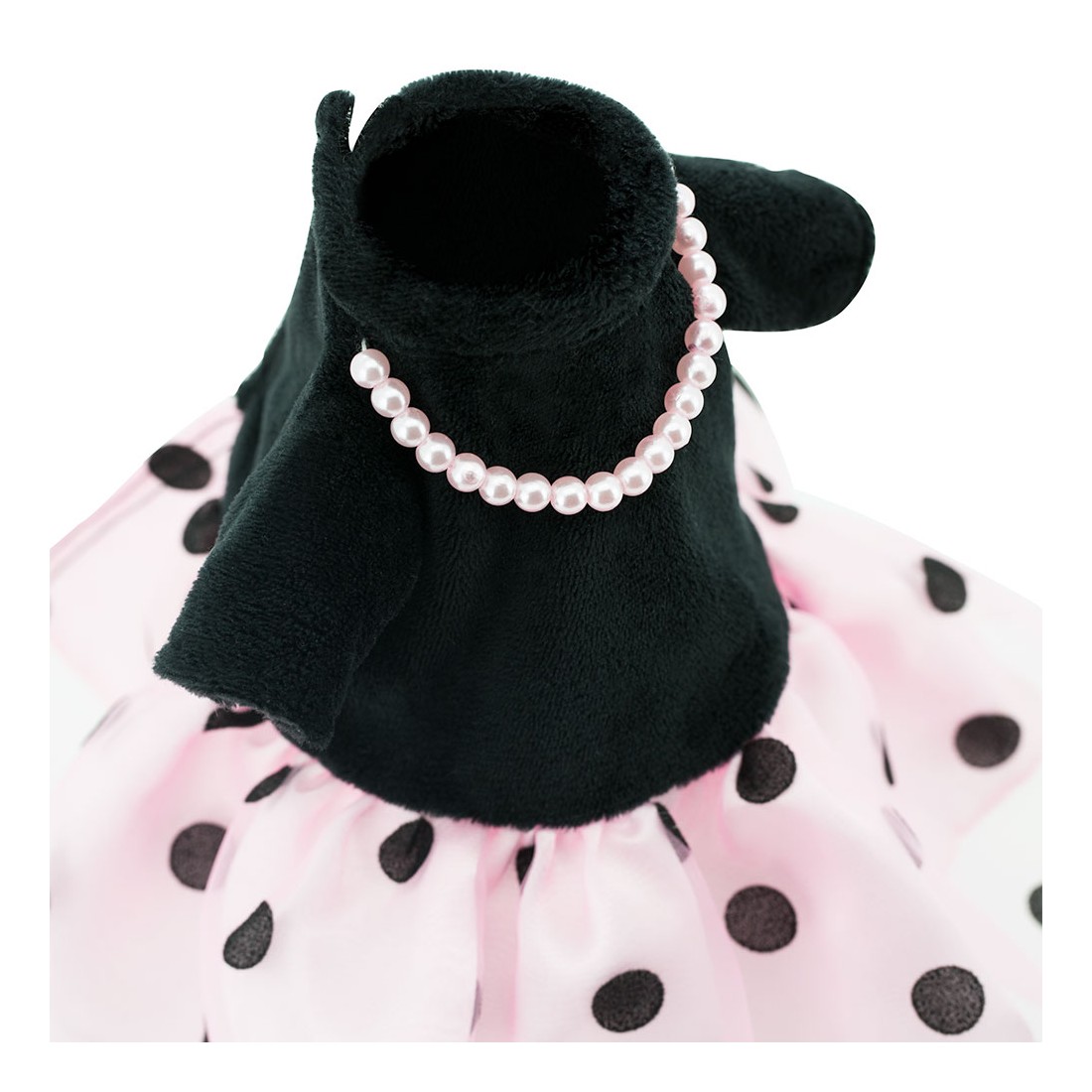Die Lucky Lili: Eleganz mit Punkten (Ref. LD003) trägt ein rosa Kleid mit schwarzen Punkten und ein schwarzes Samtoberteil mit einer rosafarbenen Perlenkette.