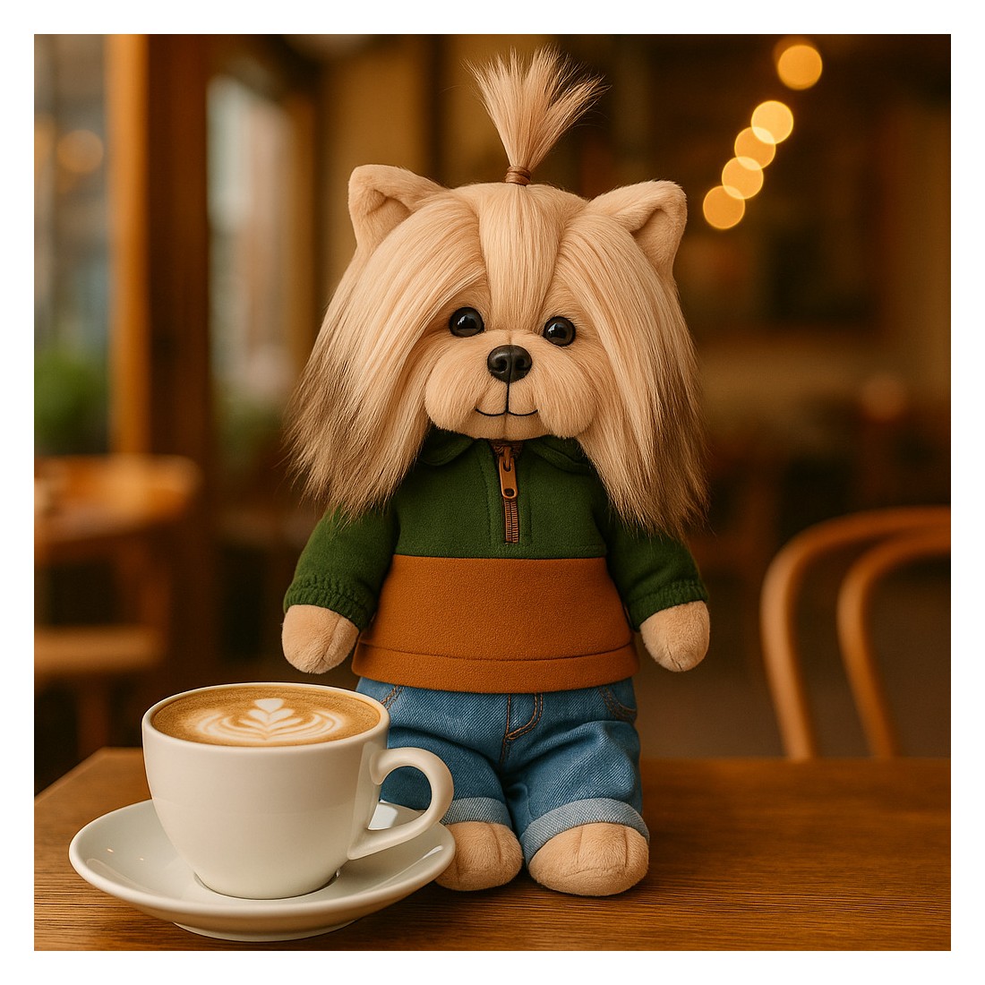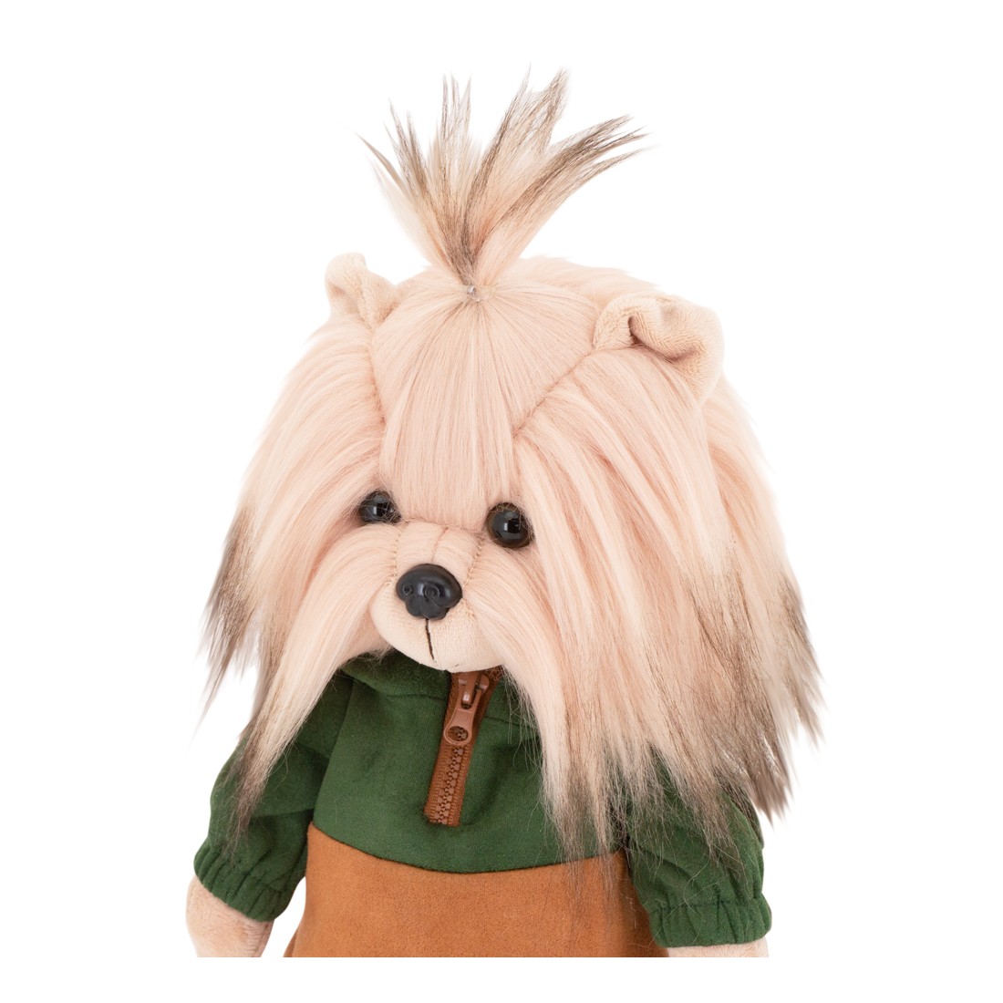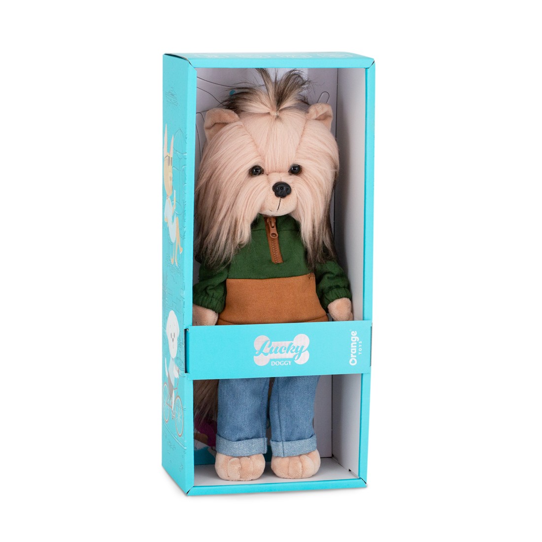Diese Lucky Doggy Plüschfigur heißt Andy. Er ist in einem herbstlichen Kapuzenpulli gekleidet – oben grün, unten karamellfarben – mit funktionalem Zipper. Seine hellblauen Jeans mit orangefarbenen Nähten und Umschlägen machen den Look komplett.