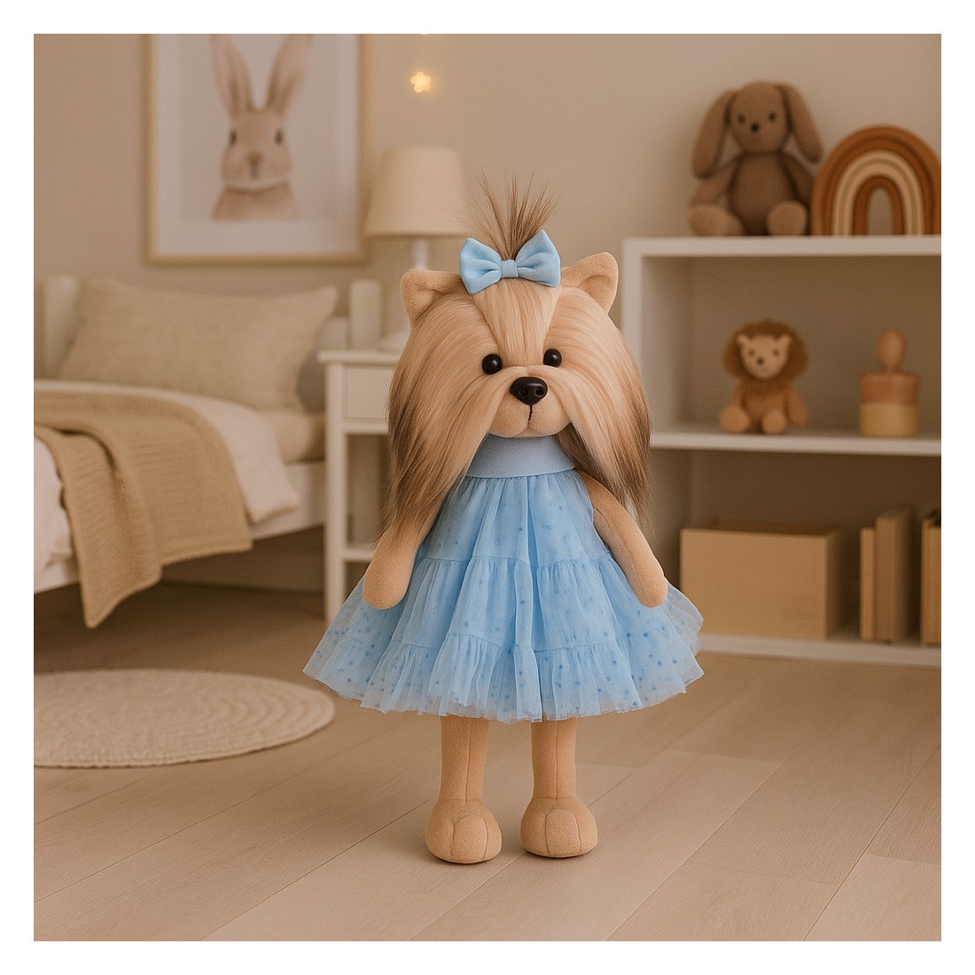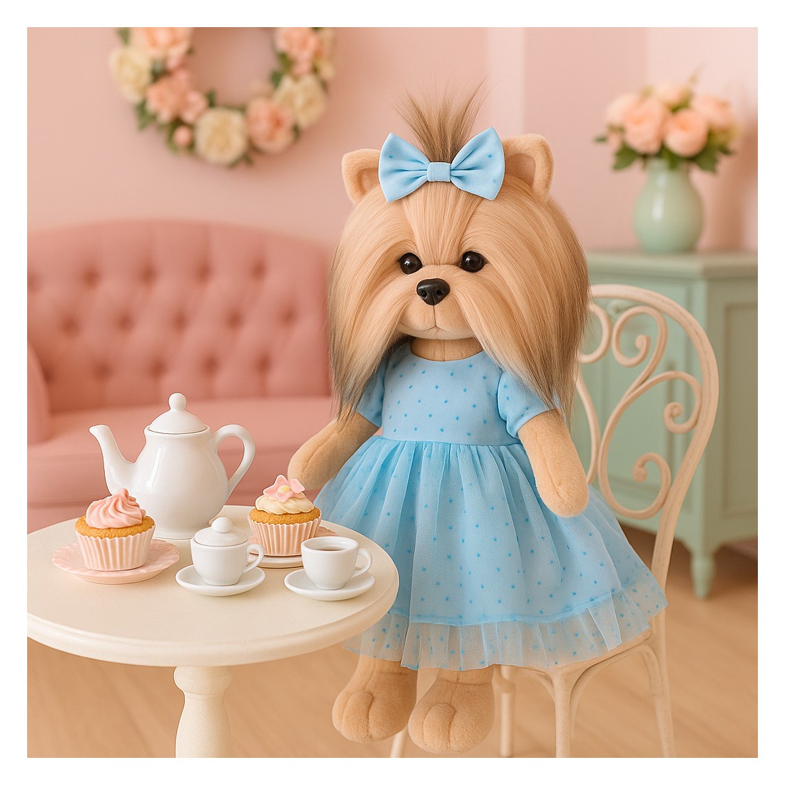 Dieses zarte himmelblaue Kleid mit Tupfen verleiht Ihrer Lucky Doggy Plüschfigur einen märchenhaften Stil.