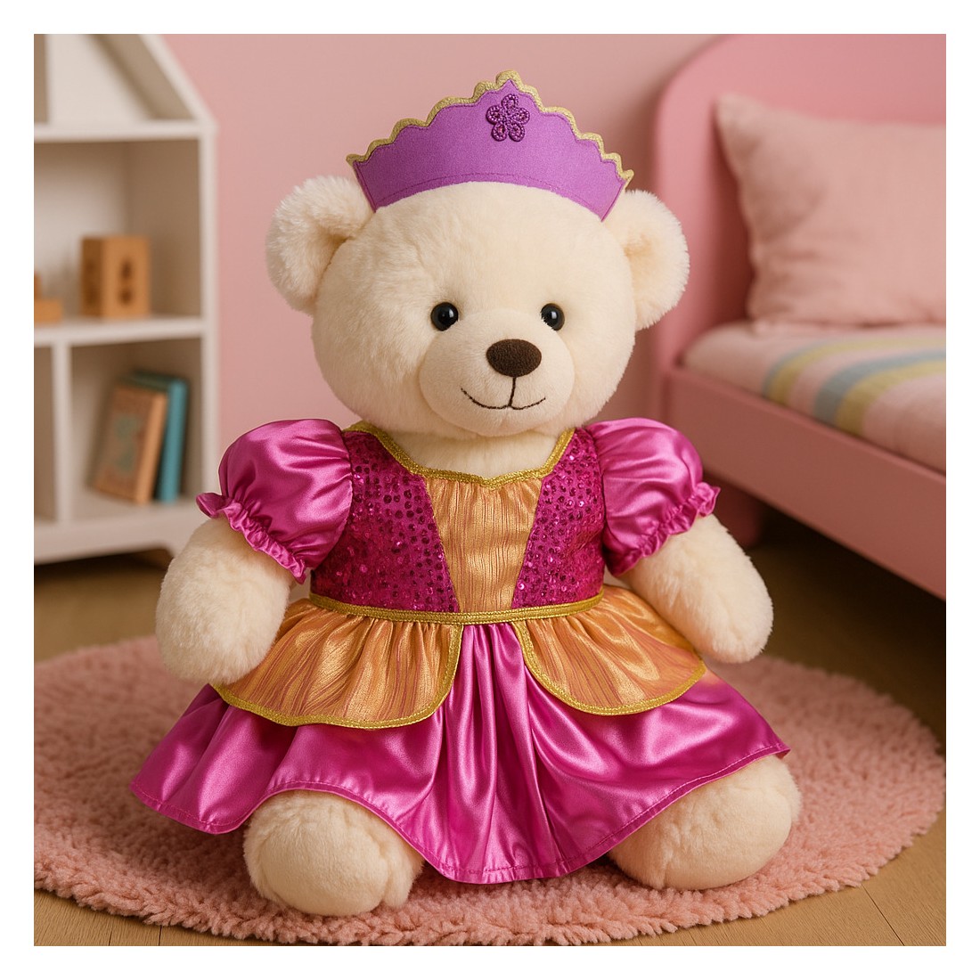 Wunderschönes rosa-goldenes Prinzessinnenkleid mit passender Krone. Verwandelt jedes Plüschtier in eine kleine Märchenkönigin. Passend für 38–45 cm Plüschtiere.