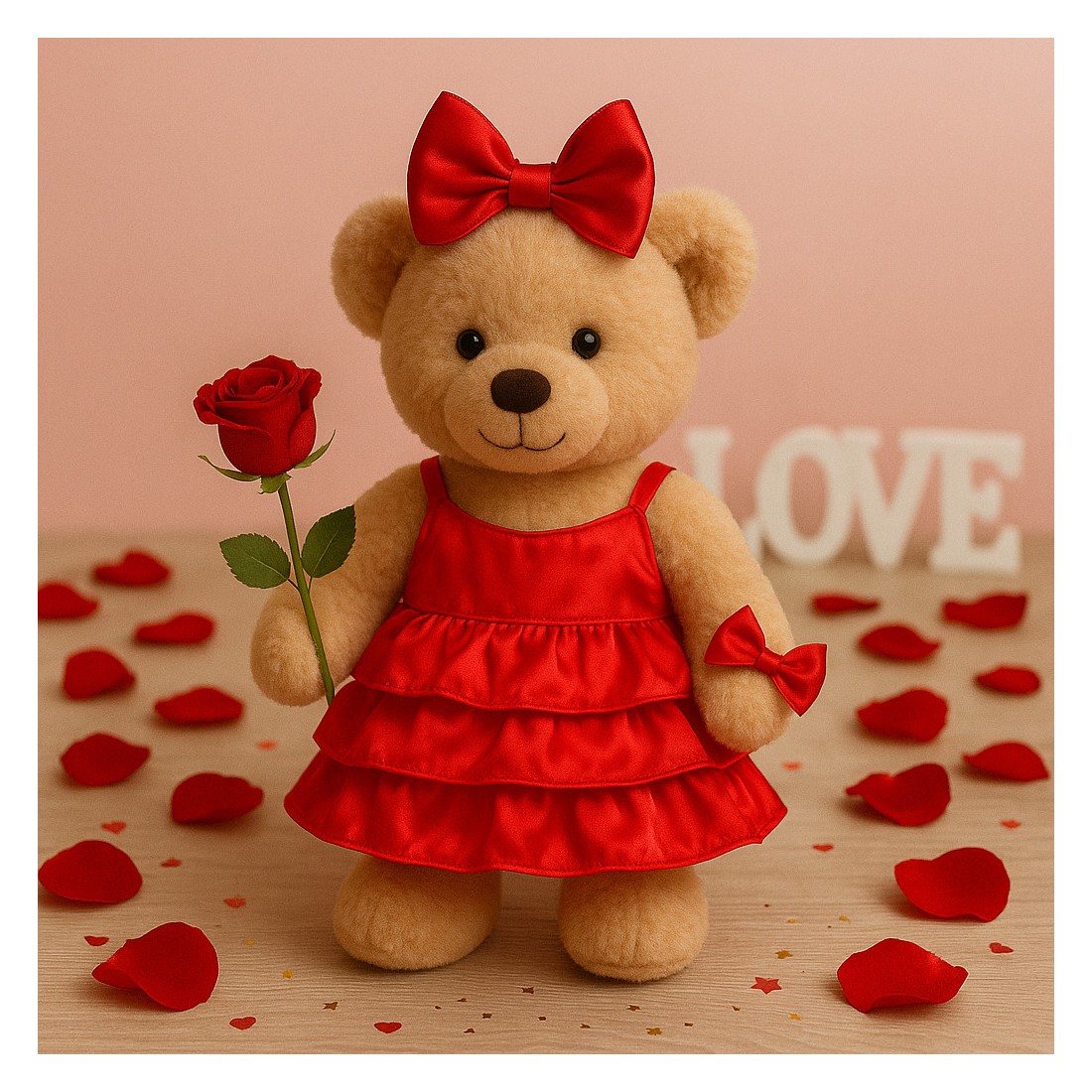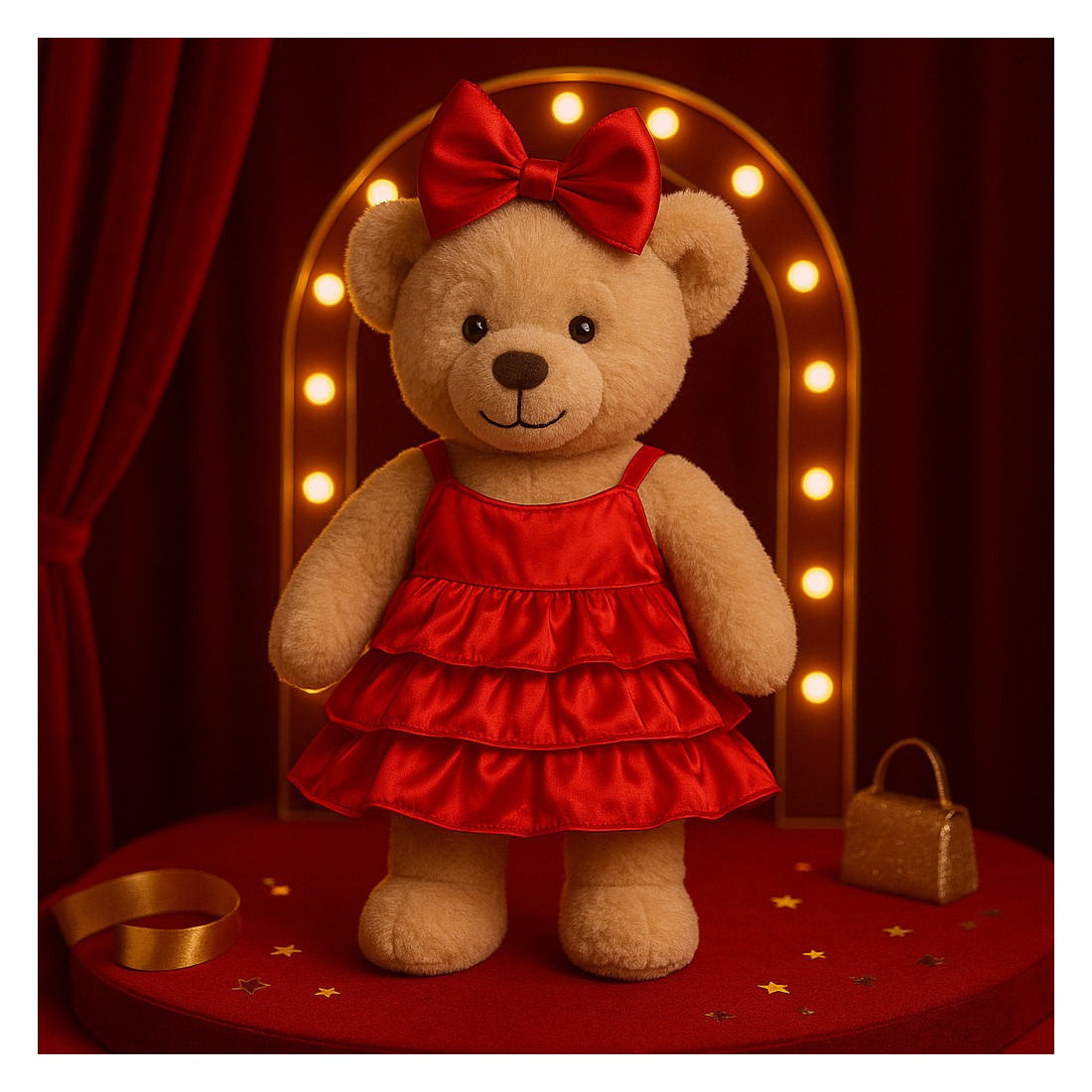 Ein elegantes rotes Satinkleid mit Rüschen und passenden Schleifen – perfekt für Plüschtiere von 38–45 cm.