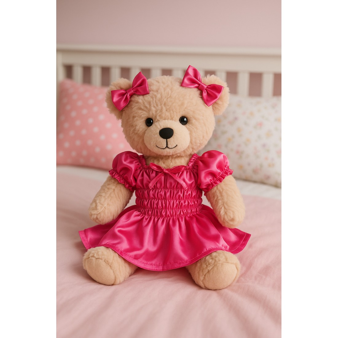 Elegantes Fuchsia-Satinkleid mit zwei passenden Schleifen, passend für 38–45 cm Plüschtiere.