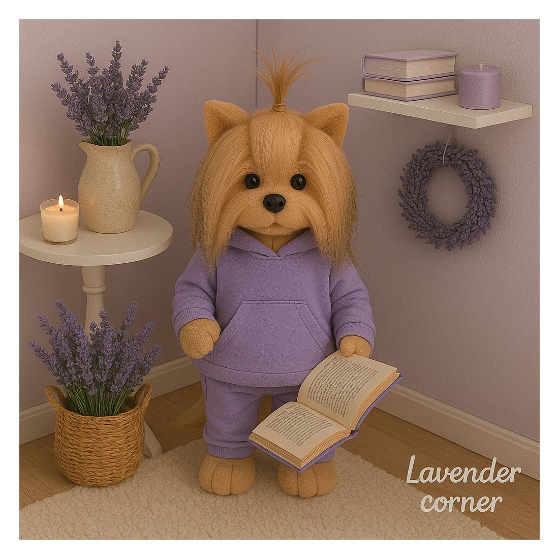 Soft, cozy, and stylish! Lucky Yoyo wears a lavender loungewear set featuring a comfy hoodie and matching pants. A chic and relaxed outfit perfect for quiet moments at home.