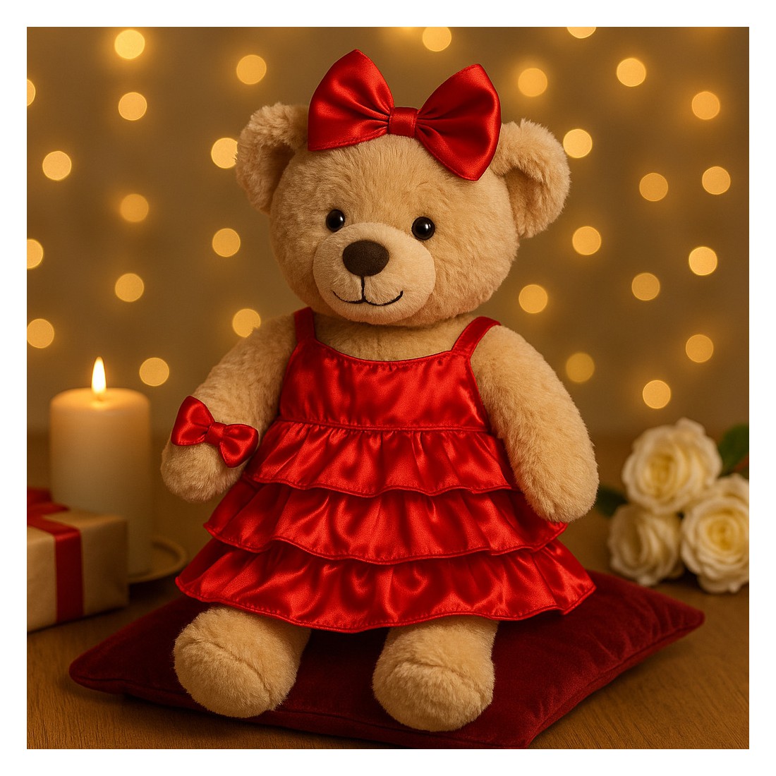 A stunning red satin ruffle dress with matching bows to dress your plush toy elegantly. Fits all 38–45 cm plush animals, including Build A Bear, Teddy Mountain, The Bear Factory, and Mon Teddy Bear.