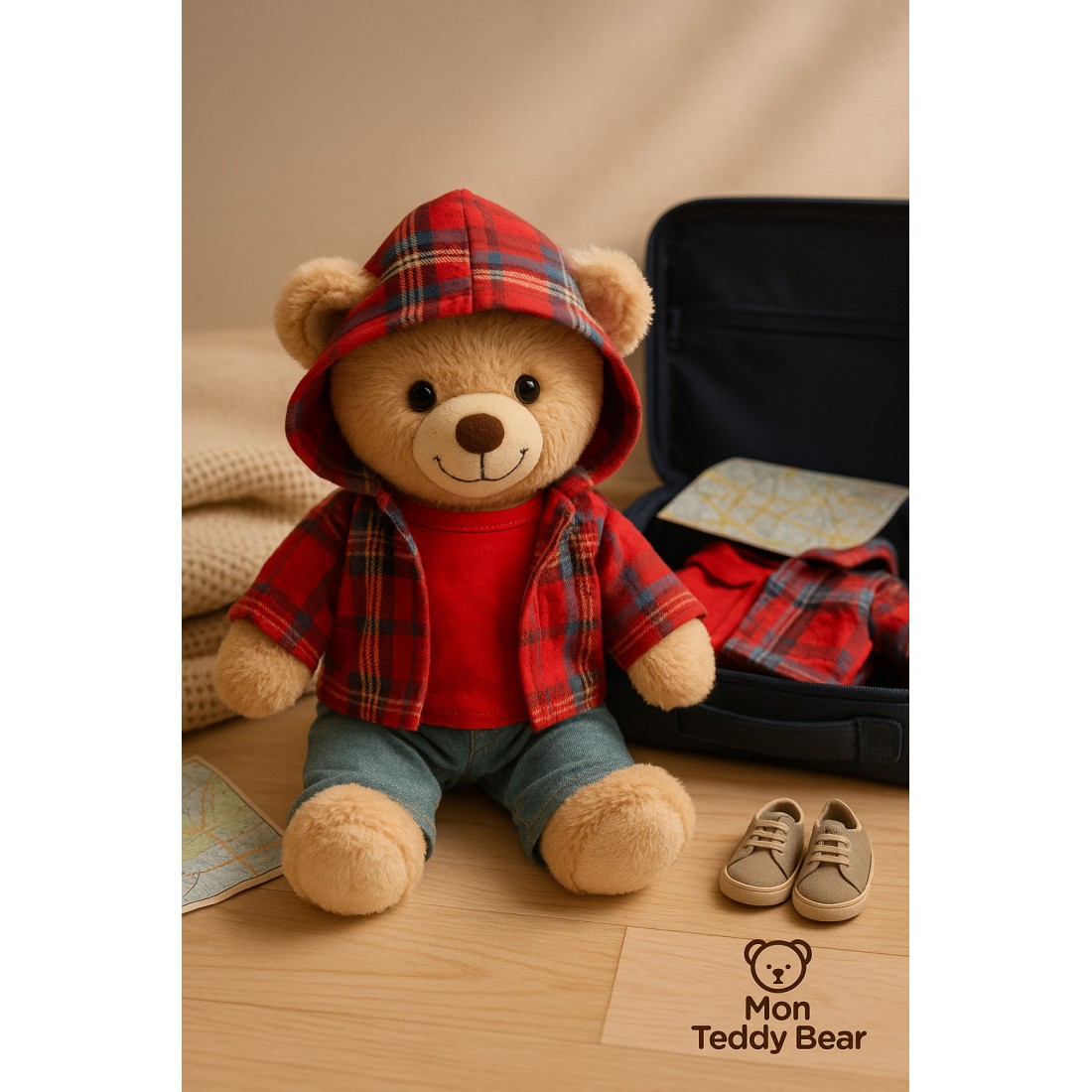 Flat lay display of a three-piece casual outfit: red t-shirt, red and blue hooded check shirt, and light blue jeans. Made by Mon Teddy Bear. Fits 38–45 cm plush toys.
