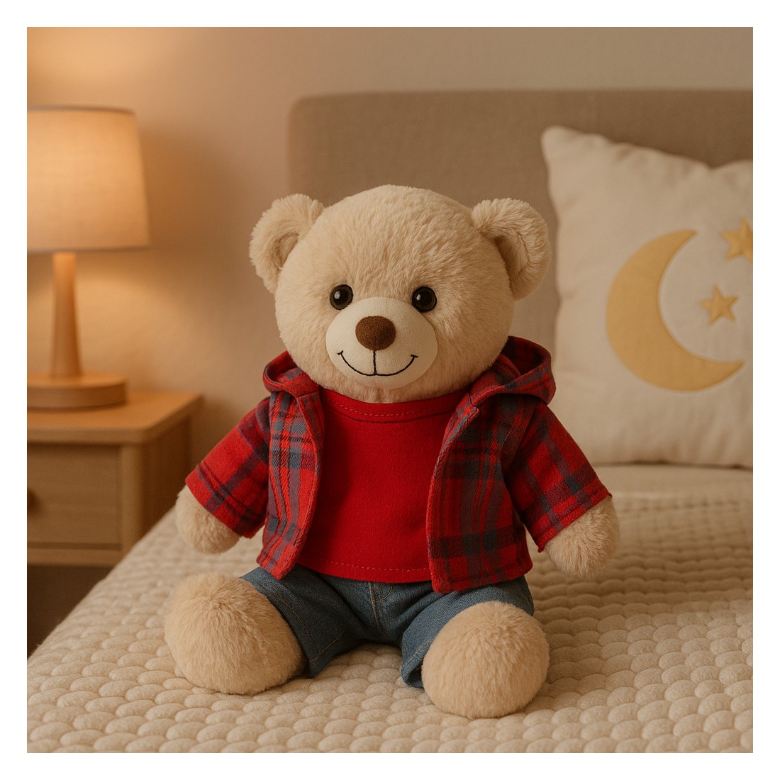 Plush clothes 40 cm – “Weekend Denim” outfit flat lay (red t-shirt, hooded check shirt, jeans) – Ref. Y1003