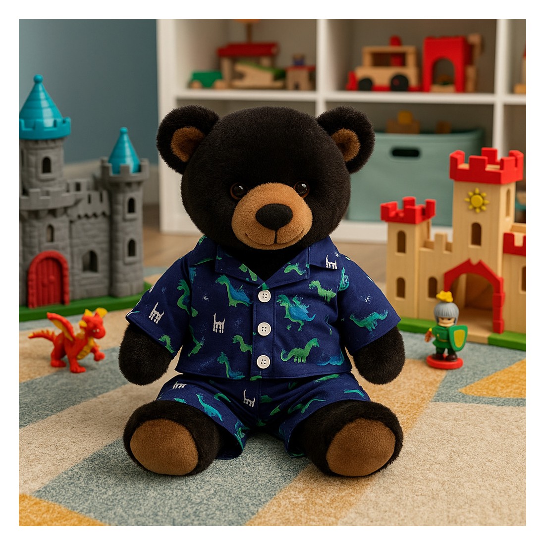 Dark blue pyjamas with castles and dinosaurs for 40 cm plush toys. Soft, fun, and cozy — perfect for bedtime cuddles!