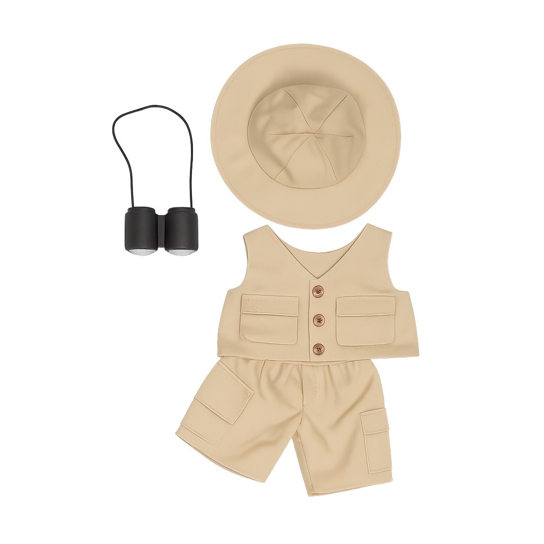 The Safari Outfit includes a beige pocket vest, matching shorts, a safari hat, and a pair of binoculars – perfect for little explorers and nature lovers.