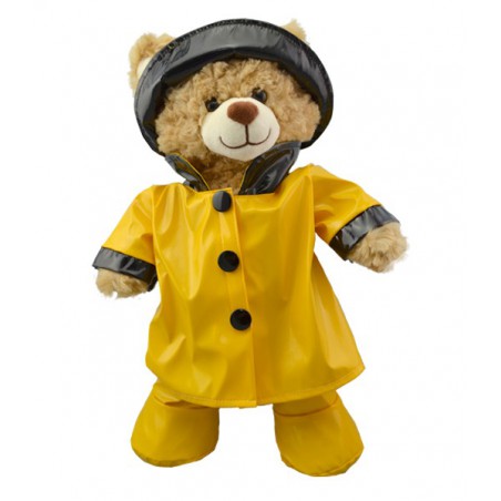 Keep your teddy bear dry and stylish with this adorable yellow raincoat set from Teddy Mountain ! Includes coat, hat, and matching boots.