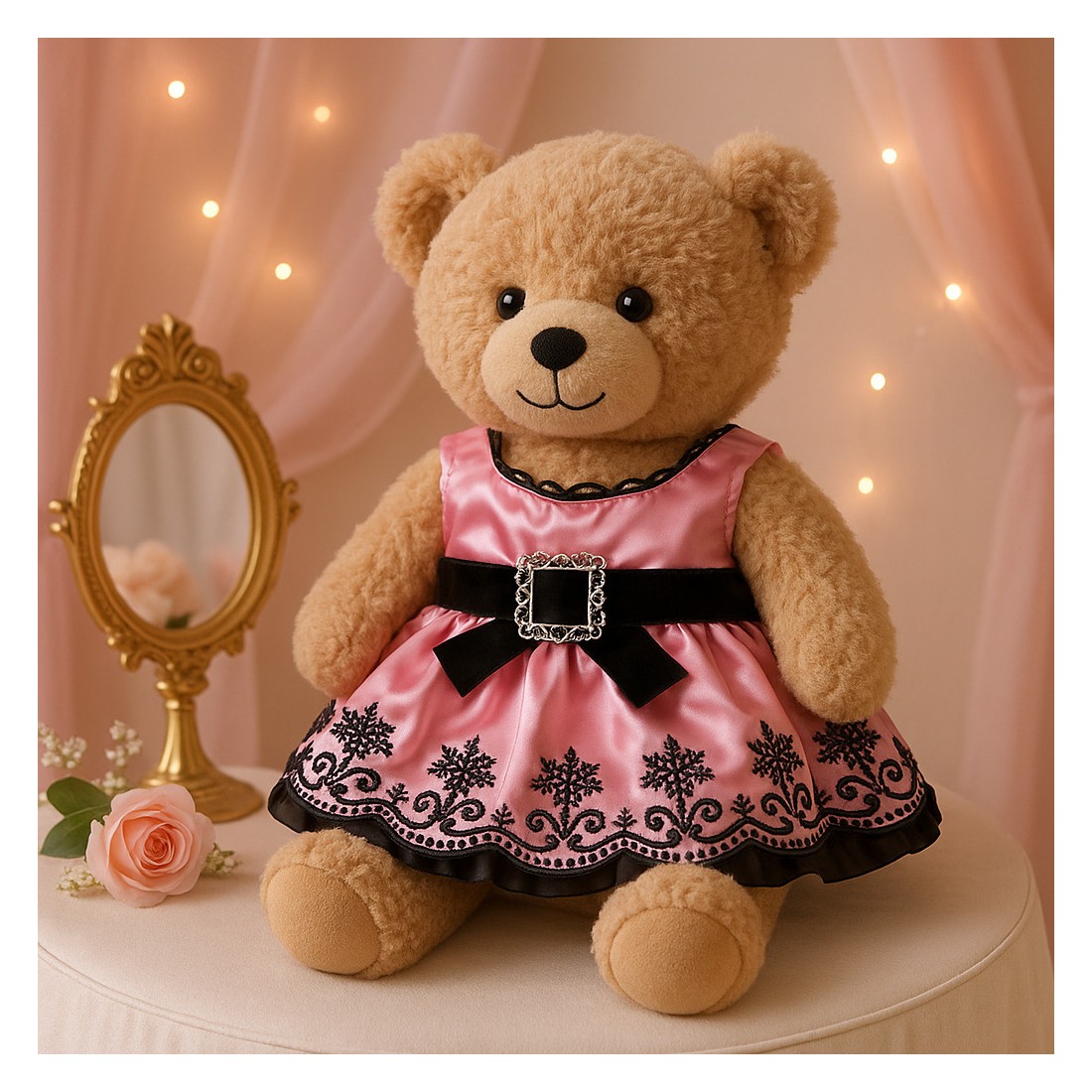 Élégante robe en satin rose ornée d’une ceinture noire en velours avec boucle argentée, finement brodée de motifs floraux noirs. Compatible avec toutes les peluches de 38 à 45 cm (Build A Bear, Teddy Mountain, The Bear Factory, Center Parcs, Mon Teddy Bear).