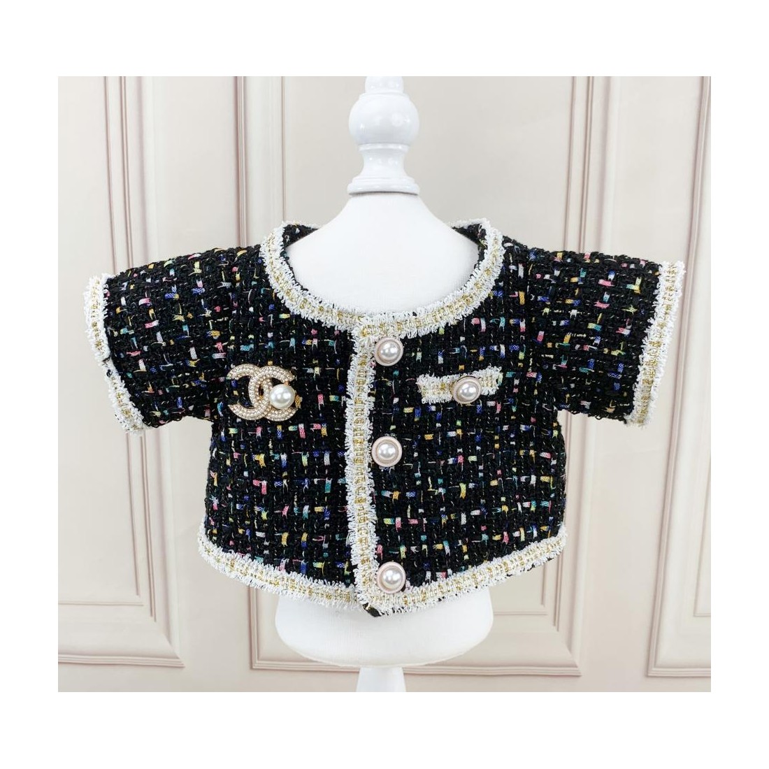 Apportez une touche de haute couture à la garde-robe de votre peluche avec cette veste en tweed noir multicolore inspirée du style Coco Chanel.