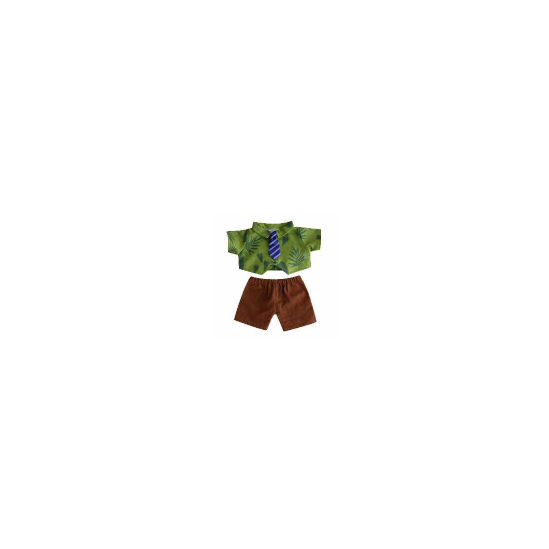 Cet ensemble composé d’une chemise verte à motifs tropicaux avec cravate et d’un short marron offre un style chic, moderne et original, idéal pour sublimer votre peluche.