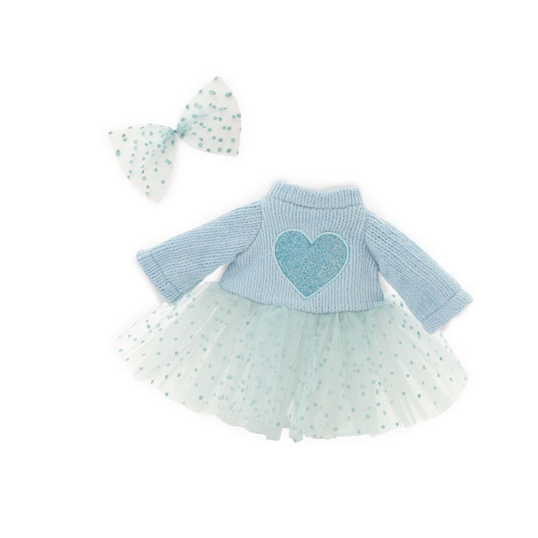 Un souffle d’hiver tout en douceur ! Cet ensemble “Ambiance Hivernale” comprend une robe en tulle léger à pois bleus et un pull bleu pastel à col roulé orné d’un cœur scintillant.