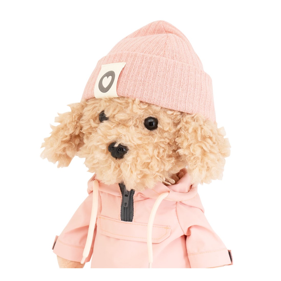 Un bonnet en maille rose avec écusson cœur, parfait pour garder votre peluche au chaud.