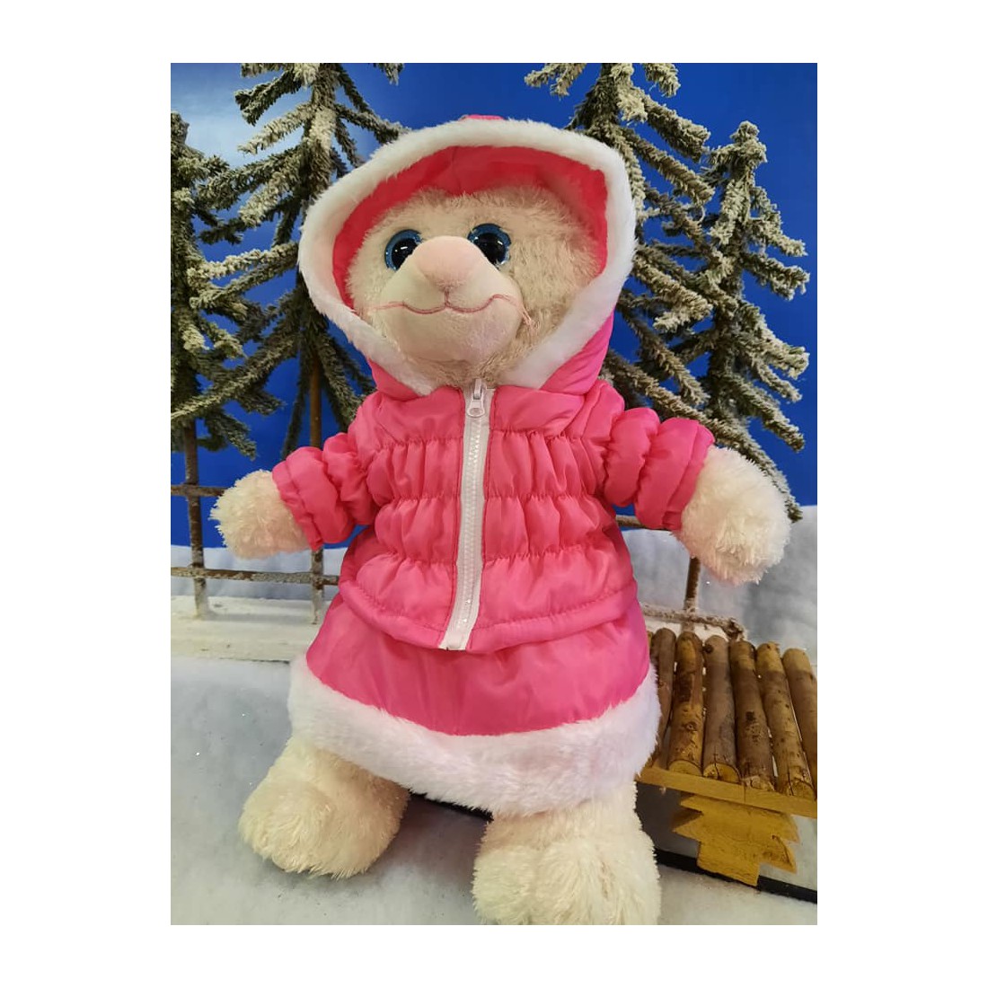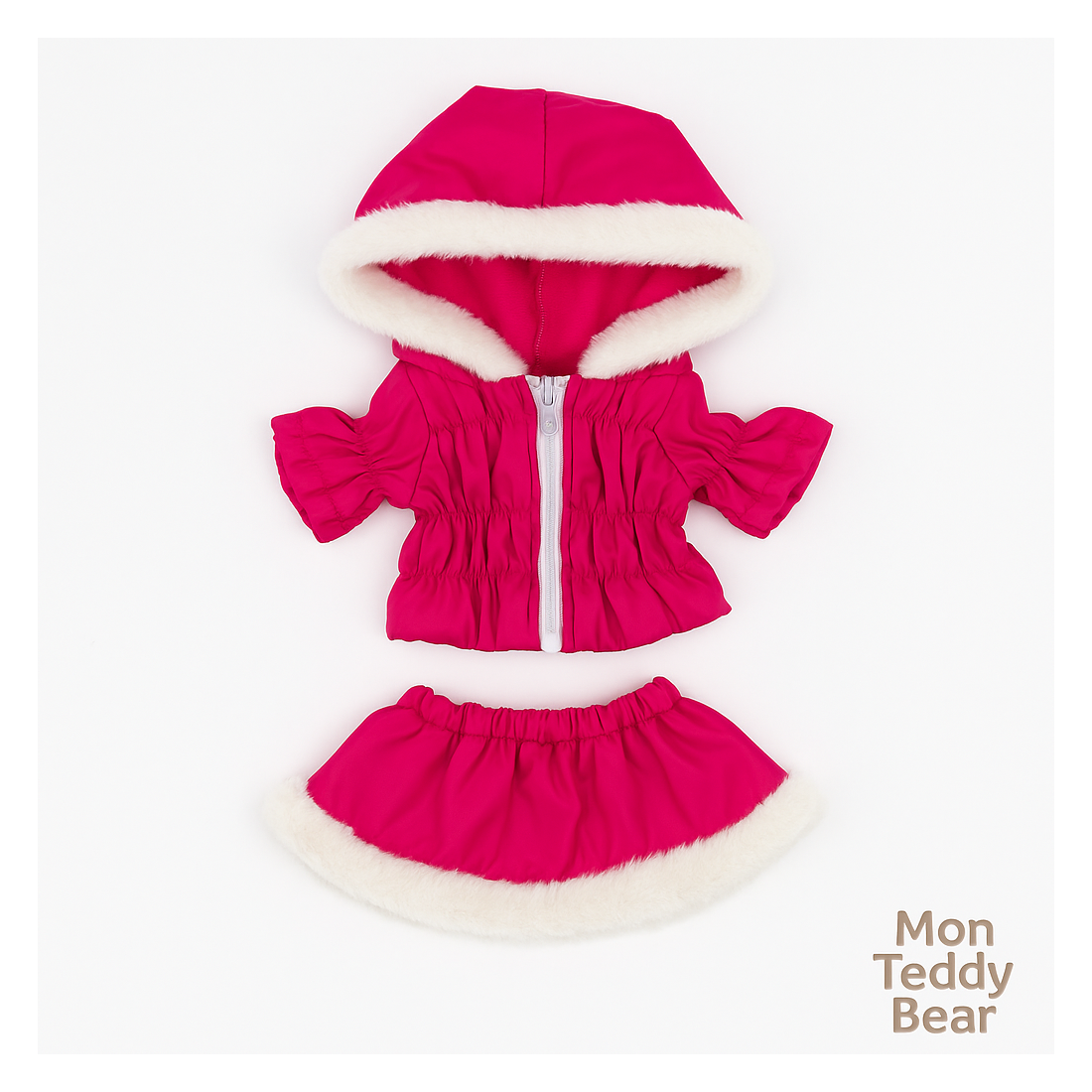 Habillez votre peluche avec élégance et douceur grâce à cet ensemble rose vif composé d’une parka doublée de fausse fourrure blanche et d’une jupe assortie.
