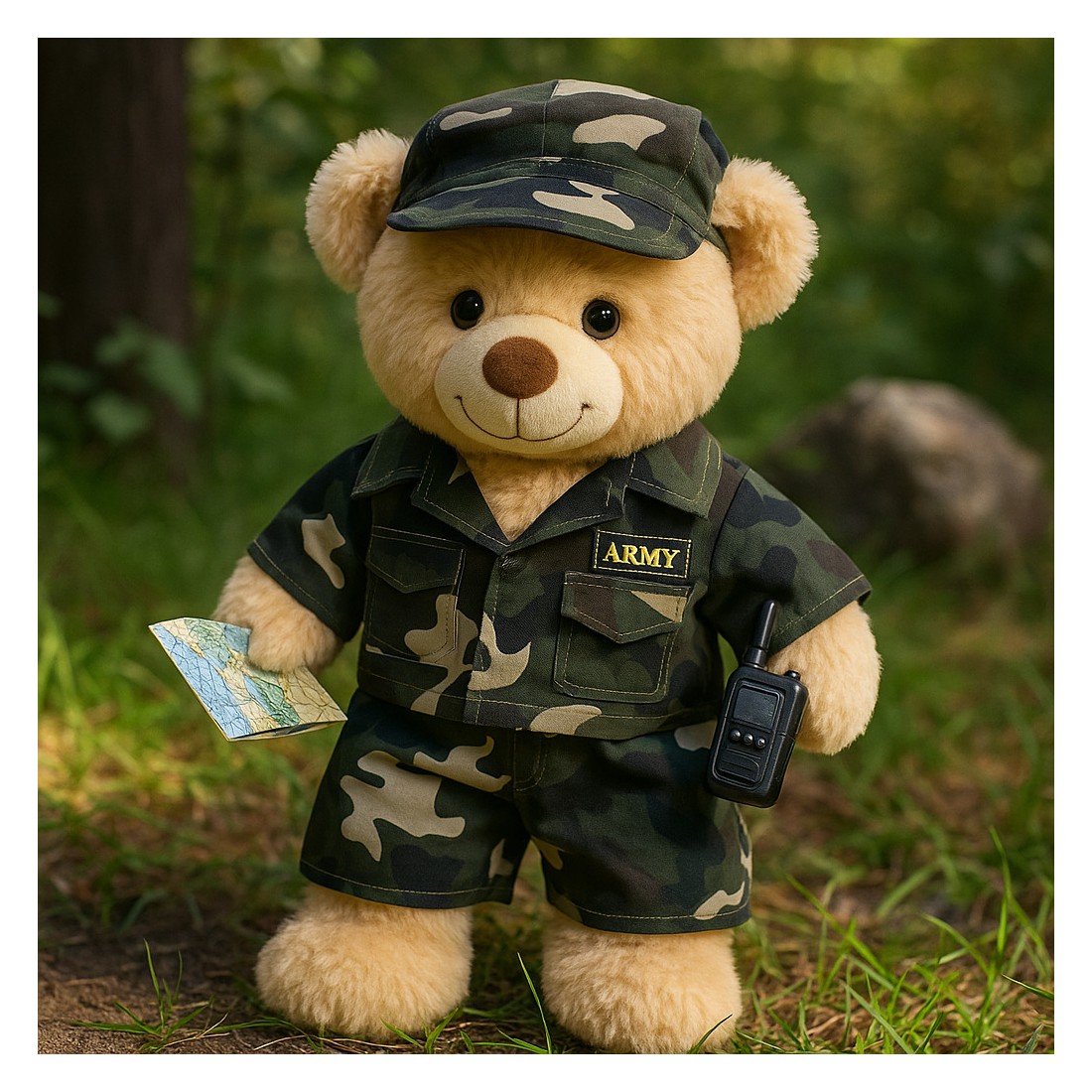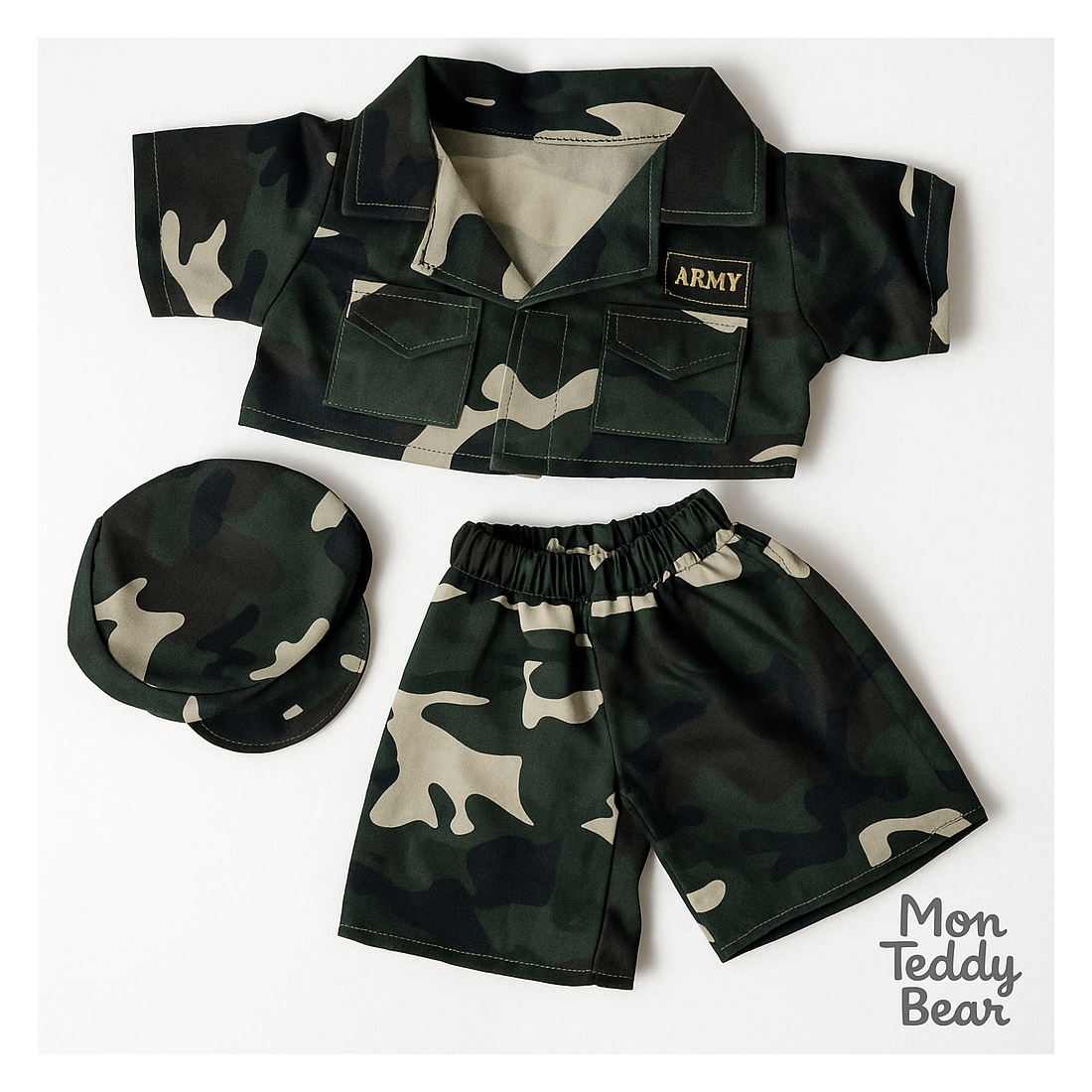 Camouflage-outfit voor knuffels: hemd, korte broek en petje. Teddy Mountain collectie.