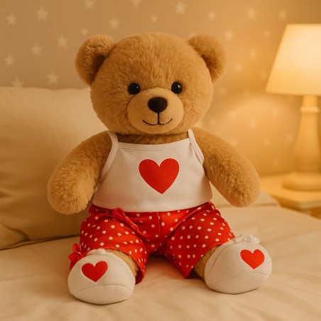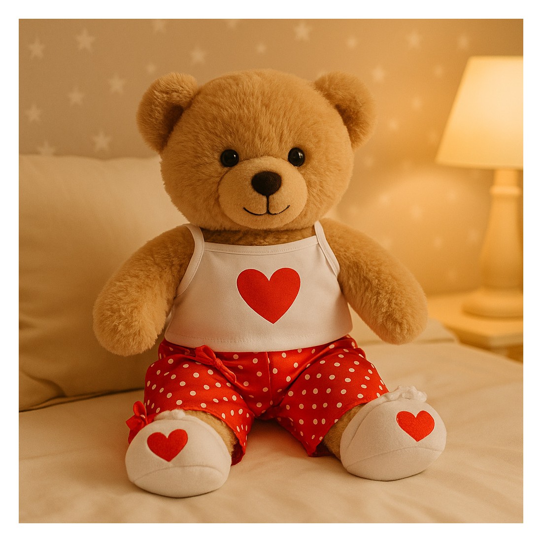 Rode Satijnen Pyjama met Witte Stippen, Hart en Pantoffels – Voor Knuffelbeer 40 cm – Ref. 2377