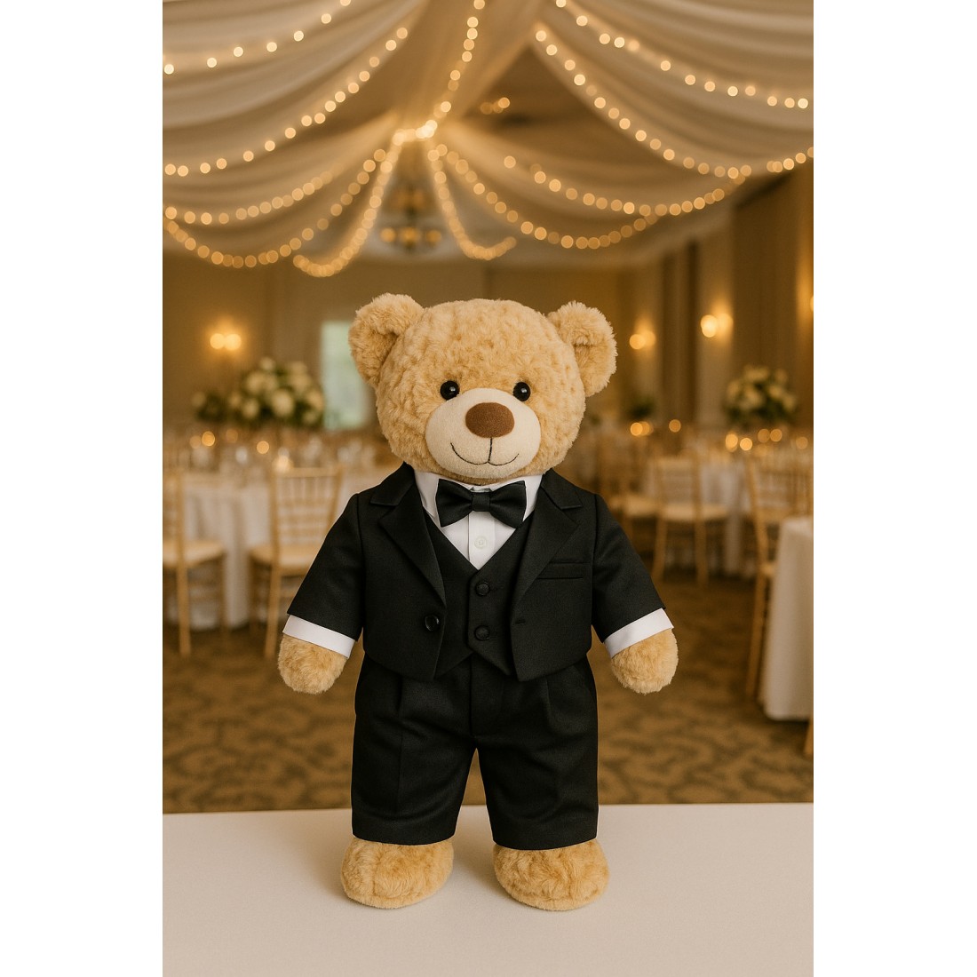 Een elegante zwarte smoking om je knuffel van 40 cm aan te kleden voor speciale gelegenheden.
