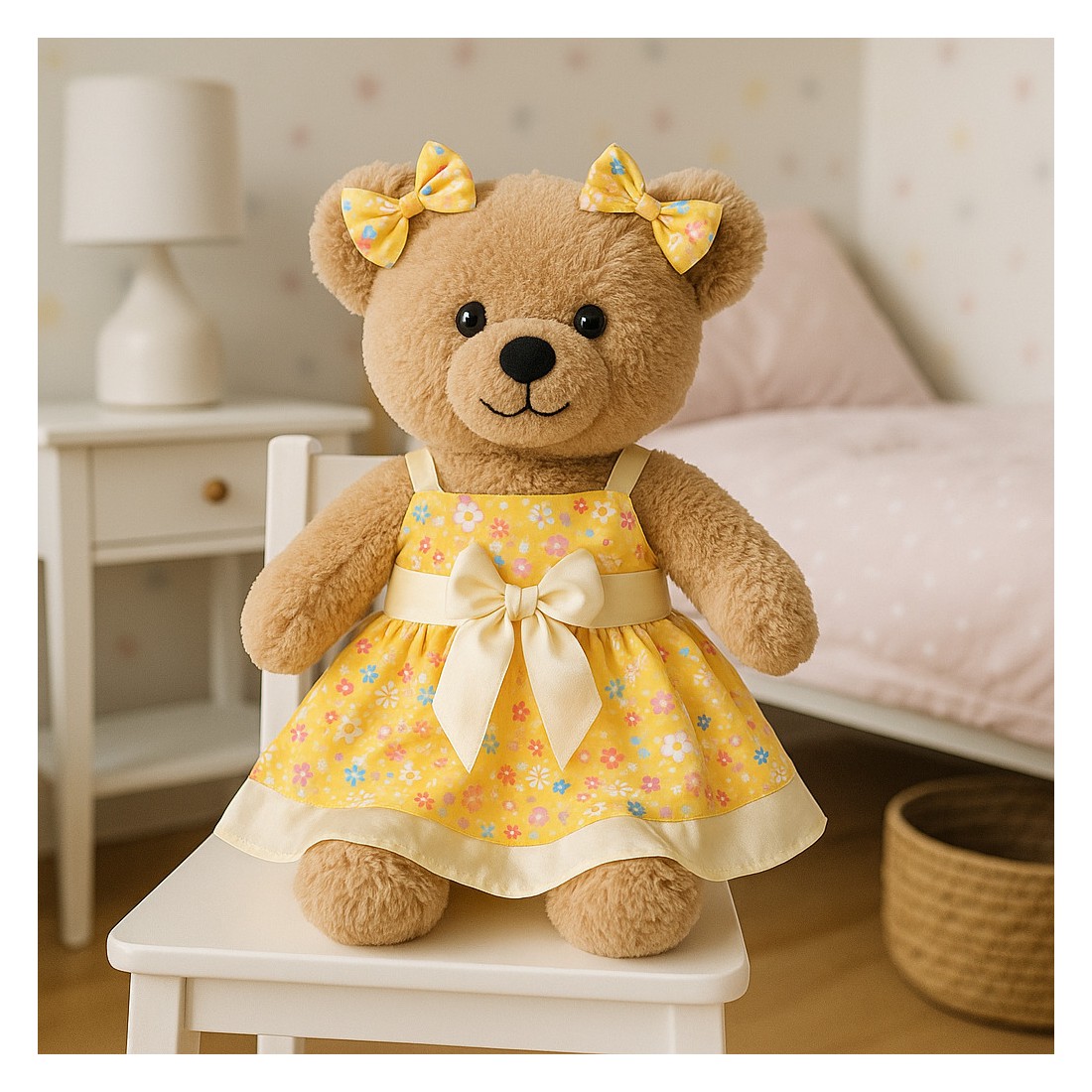 Gele zomerbloemenjurk met 2 strikjes – Voor Knuffelbeer 40 cm – Ref. 2668