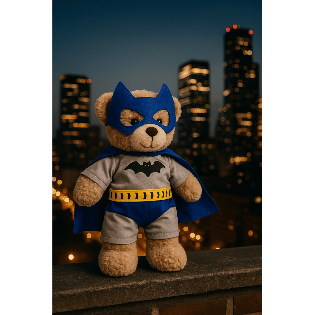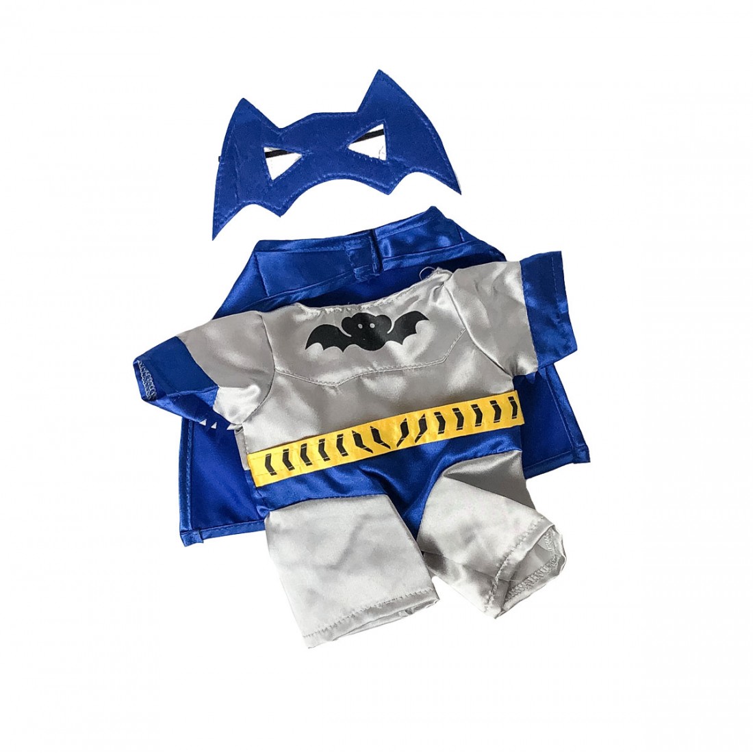 Het kostuum past perfect op een knuffel van 40 cm en bestaat uit een grijs pak met vleermuissymbool, een glanzende blauwe cape en een masker.