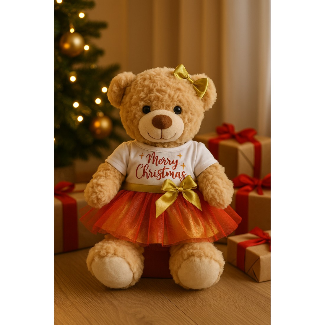 Geef je knuffel een feestelijke look met deze rode en gouden "Merry Christmas" tutu-jurk.