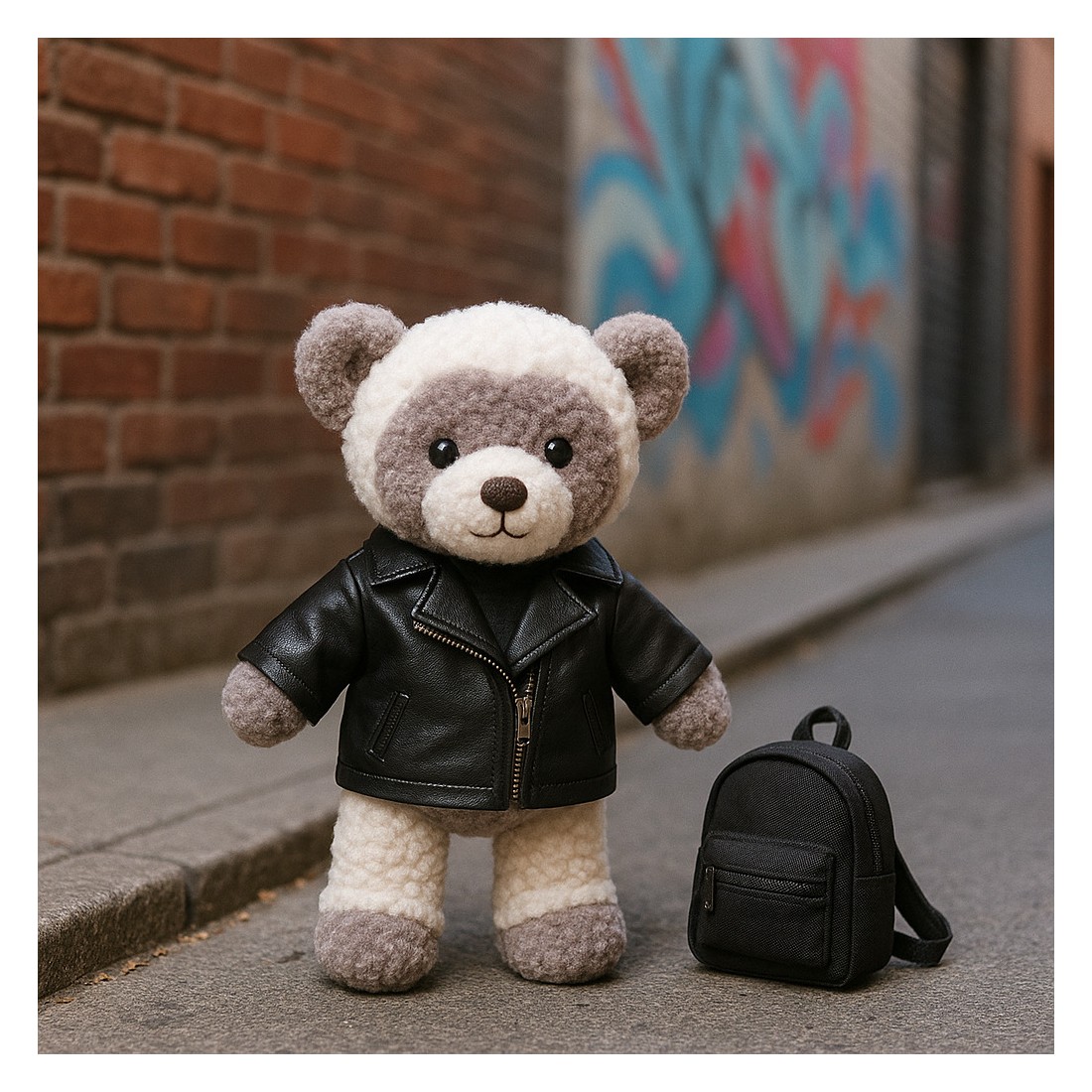 Een stijlvolle zwarte kunstleren bikerjas voor knuffels van 38–45 cm. Een stoere, modieuze look voor jouw knuffelvriend.