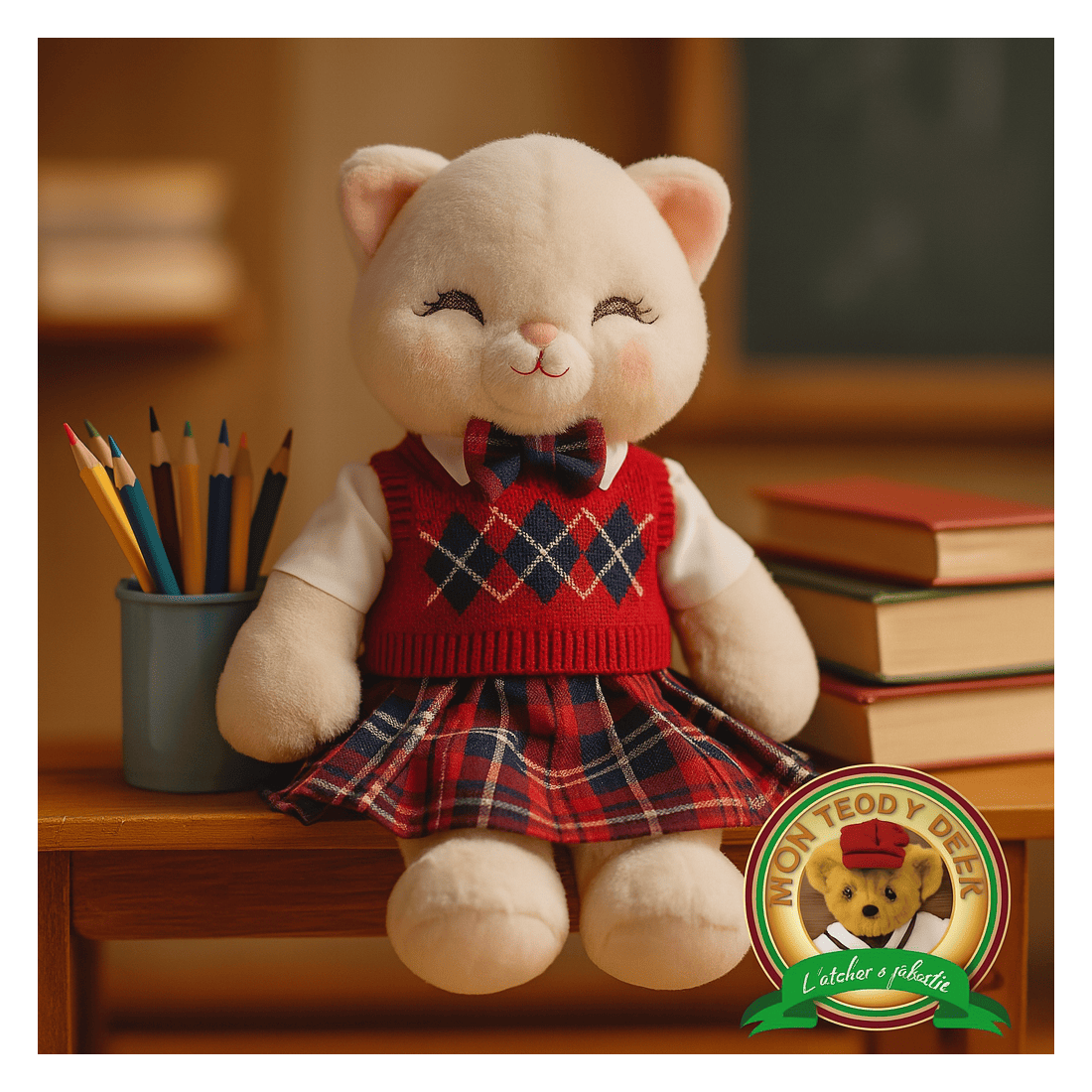 Een schattige schooloutfit voor je knuffel! Met een rode trui zonder mouwen, een witte blouse met strikje en een geplooide geruite rok ziet je knuffel eruit als een perfecte leerling.