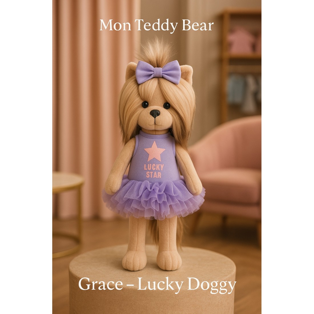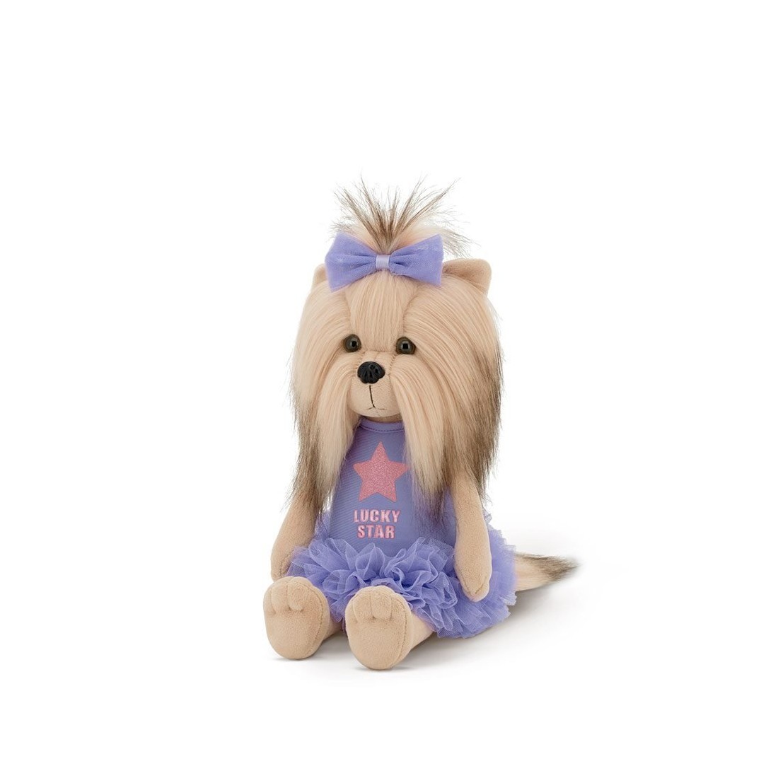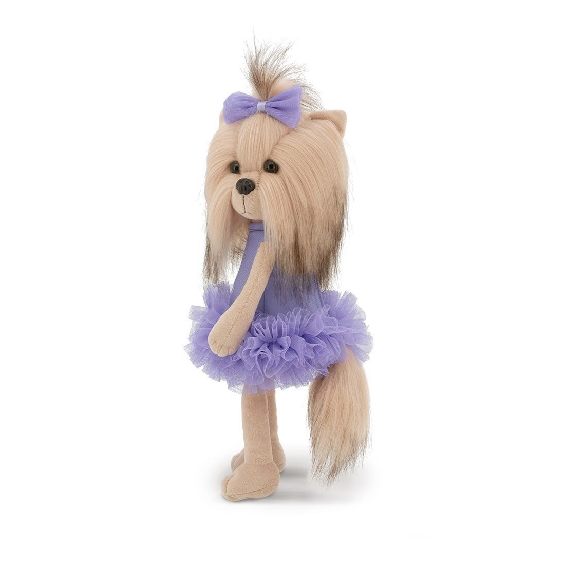 De beweegbare knuffel Lucky Yoyo (Lucky Doggy-serie, Ref. LD3/032) draagt een prachtige lavendelkleurige tutu-jurk.