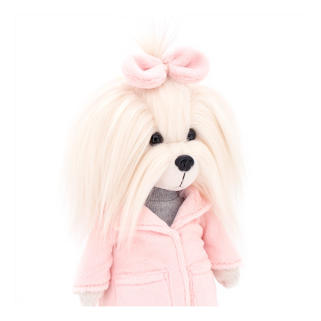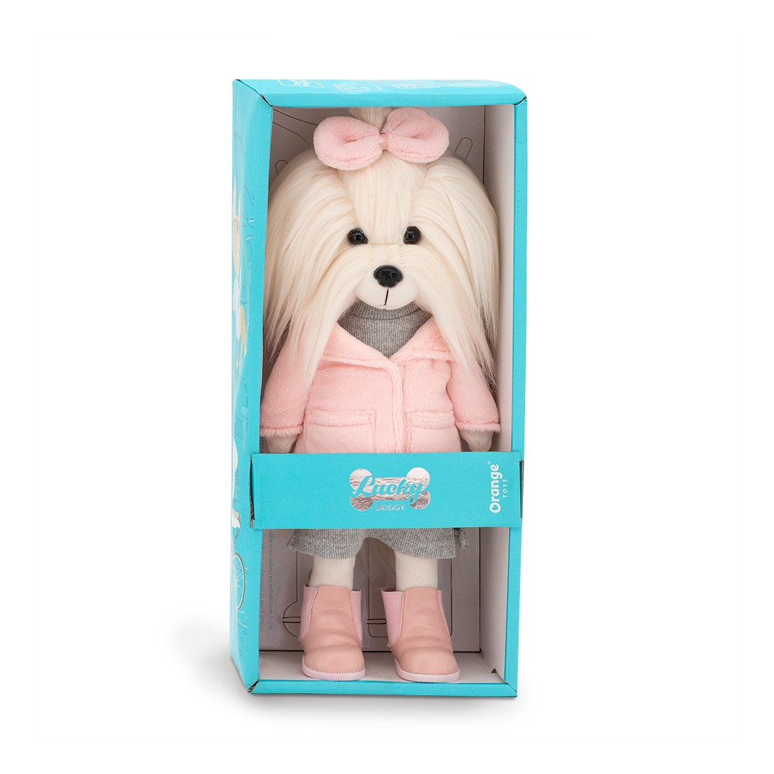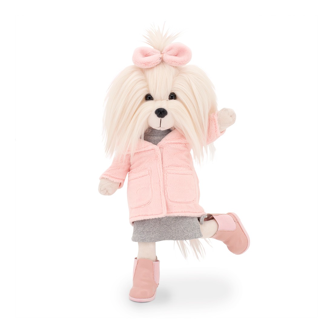 Lucky Yoyo straalt elegantie uit in haar roze jas, grijze jurk en roze laarsjes. Een beweegbare knuffel met winterse charme.