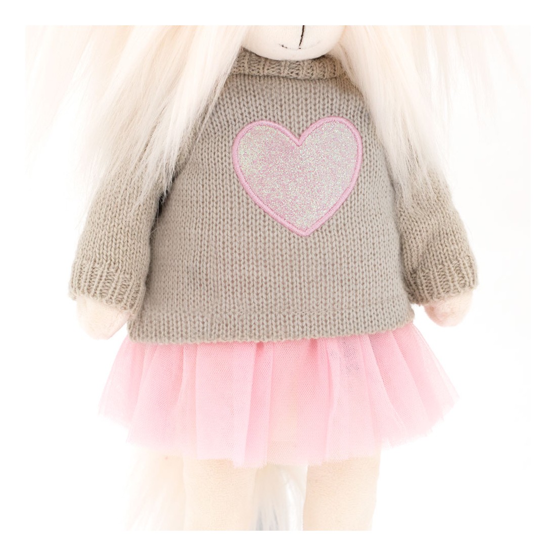 Lucky Yoyo straalt zachtheid uit in haar beige trui met roze glitterhart en roze tule rok. Een zachte knuffel zonder metalen structuur.